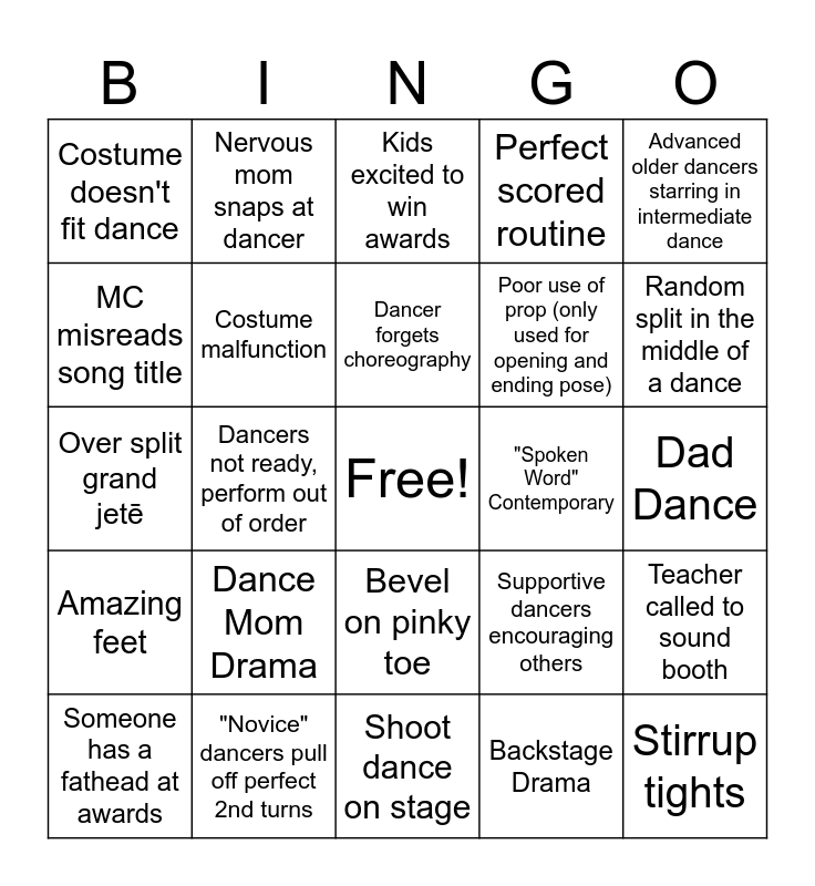 This bingo card has a free space and 53 words: Wearing only 1 dance shoe, Stirrup tights, Performing in socks, Backstage Drama, Dance Mom Drama, Nervous dancer snaps at mom, Nervous mom snaps at dancer, Announcer mispronounces dance /dancer’s name, MC misreads song title, Hair piece falls off, Costume malfunction, Music stops during dance, Teacher called to sound booth, Supportive dancers encouraging others, Child eating super sized pixie stick, Someone has a fathead at awards, Dancer forgets choreography, "Spoken Word" Contemporary, An actual Jazz dance that isn't contemporary, Advanced older dancers starring in intermediate dance, Dancers not ready, perform out of order, Huge unnecessary prop, Poor use of prop (only used for opening and ending pose), Costume doesn't fit dance, Jazz square for the win, "Novice" dancers pull off perfect 2nd turns, Pick a wedgie on stage, Fix hair on stage, Massive loss of feathers, Random split in the middle of a dance, Multiple turn combinations, 3 solos by 1 dancer - all look the same, "A Million Dreams", Flat footed turns, 5 Perfect Turns, Awkward MC moment, Perfect scored routine, Shoot dance on stage, Kids excited to win awards, Dancers win, but not excited, Pre-award wobble, Props Dad's bust a move, Dad Dance, Adult Dance, Random tumbling pass, Bevel on pinky toe, Inappropriate Music for Age, Sassy Minis, Over split grand jetē, Amazing feet, Left turns, Uses a bridge and Dance with Bench.
