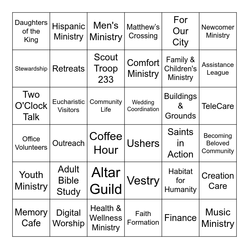 This bingo card has 37 words: Habitat for Humanity, Vestry, Finance, Stewardship, Outreach, Buildings & Grounds, Retreats, Faith Formation, For Our City, Memory Cafe, Assistance League, Matthew’s Crossing, Two O'Clock Talk, Community Life, Newcomer Ministry, Wedding Coordination, Adult Bible Study, Men's Ministry, TeleCare, Eucharistic Visitors, Daughters of the King, Comfort Ministry, Coffee Hour, Saints in Action, Digital Worship, Becoming Beloved Community, Hispanic Ministry, Health & Wellness Ministry, Creation Care, Altar Guild, Liturgical Leaders, Ushers, Family & Children's Ministry, Youth Ministry, Office Volunteers, Scout Troop 233 and Music Ministry.
