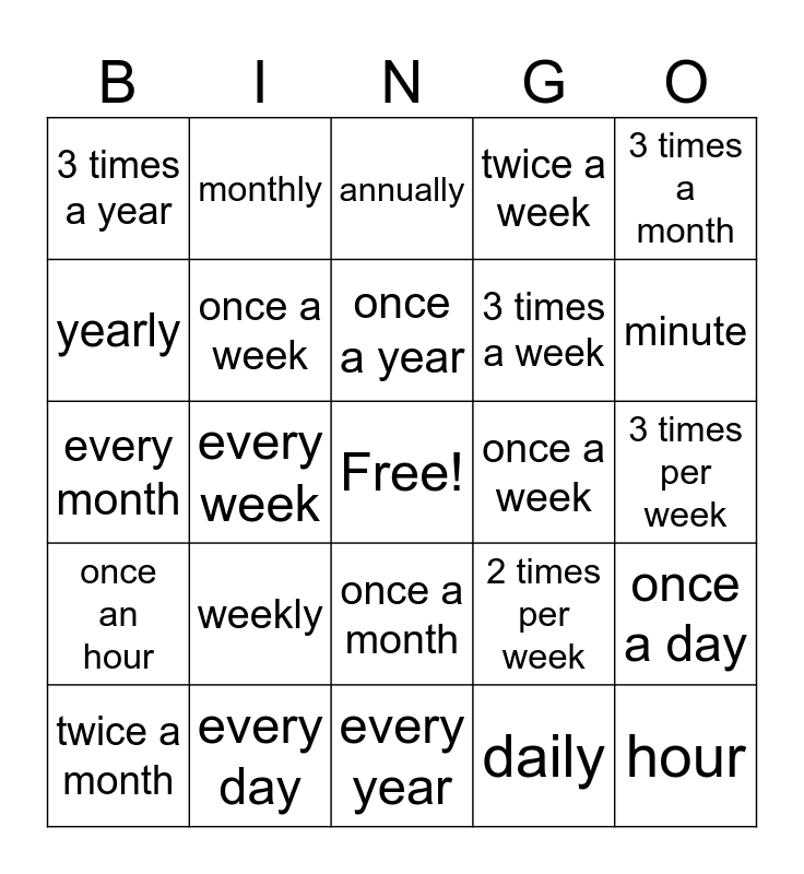 This bingo card has a free space and 24 words: weekly, every day, once a year, twice a month, 3 times a month, 3 times a year, yearly, monthly, once a week, once a month, 3 times a week, every month, 2 times per week, once a day, once a week, daily, 3 times per week, annually, minute, every week, hour, once an hour, twice a week and every year.