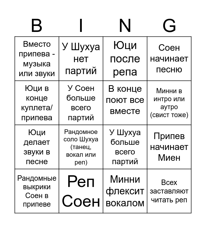 This bingo card has 16 words: Реп Соен, Припев начинает Миен, Юци после репа, Вместо припева - музыка или звуки, Юци делает звуки в песне, У Шухуа нет партий, У Шухуа больше всего партий, Минни флексит вокалом, Юци в конце куплета/припева, У Соен больше всего партий, Рандомные выкрики Соен в припеве, Соен начинает песню, Рандомное соло Шухуа (танец, вокал или реп), Минни в интро или аутро (свист тоже), В конце поют все вместе and Всех заставляют читать реп.