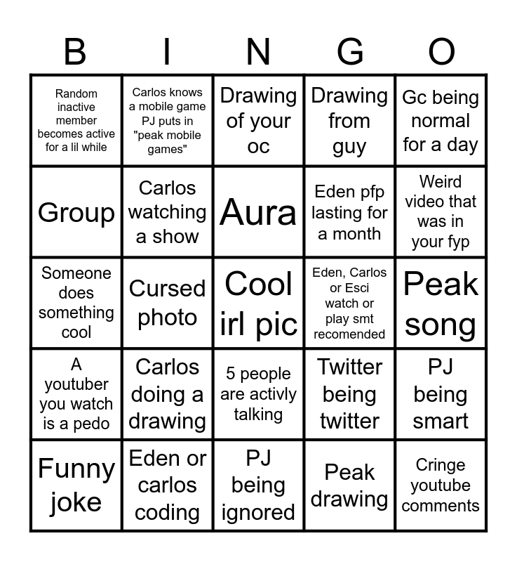 This bingo card has 27 words: Funny joke, Eden or carlos coding, Aura, Peak drawing, Weird video that was in your fyp, Random inactive member becomes active for a lil while, Carlos knows a mobile game PJ puts in "peak mobile games", 5 people are activly talking, Eden pfp lasting for a month, Cringe youtube comments, Someone does something cool, Carlos watching a show, PJ being ignored, Twitter being twitter, Peak song, Esci actually finishes a drawing/song, Cursed photo, Drawing of your oc, Eden, Carlos or Esci watch or play smt recomended, Gc being normal for a day, A youtuber you watch is a pedo, Carlos doing a drawing, Cool irl pic, Drawing from guy, PJ being smart, Group and Chat.