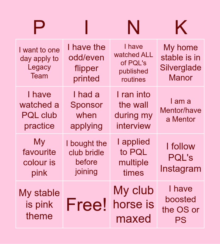 This bingo card has 16 words: Free!, I follow PQL's Instagram, I have watched ALL of PQL's published routines, I want to one day apply to Legacy Team, My favourite colour is pink, I have the odd/even flipper printed, I applied to PQL multiple times, My club horse is maxed, I have watched a PQL club practice, I had a Sponsor when applying, My stable is pink theme, My home stable is in Silverglade Manor, I bought the club bridle before joining, I am a Mentor/have a Mentor, I ran into the wall during my interview and I have boosted the OS or PS.