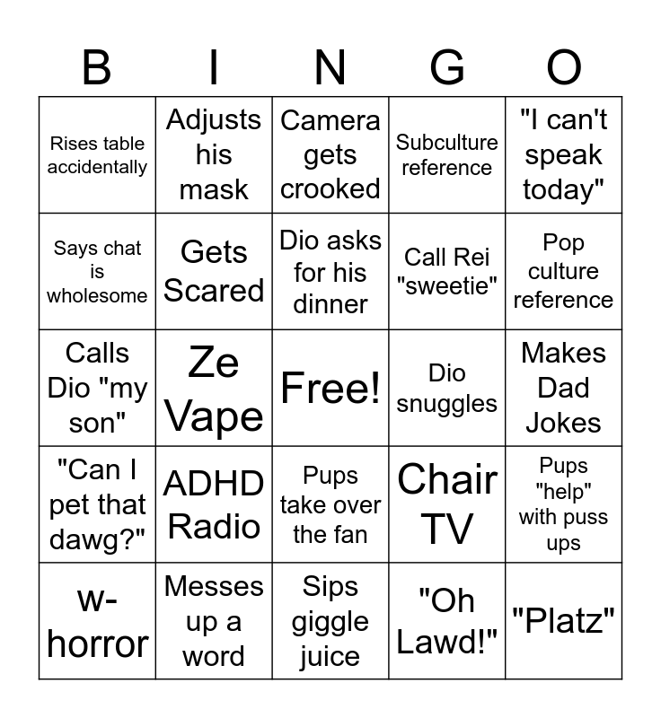 This bingo card has a free space and 24 words: ADHD Radio, Messes up a word, Dio asks for his dinner, w-horror, "I can't speak today", Rises table accidentally, Says chat is wholesome, Adjusts his mask, Dio snuggles, Pups take over the fan, Call Rei "sweetie", Calls Dio "my son", Chair TV, Pups "help" with puss ups, Gets Scared, "Oh Lawd!", Makes Dad Jokes, Camera gets crooked, Pop culture reference, Ze Vape, "Platz", "Can I pet that dawg?", Subculture reference and Sips giggle juice.