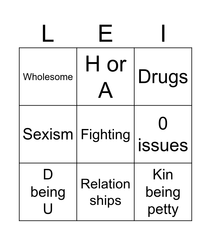 This bingo card has a free space and 11 words: Small Children, Relation ships, Kin being petty, D being U, H or A, Drugs, 0 issues, Gayness, Sexism, Wholesome and "-sigh-".