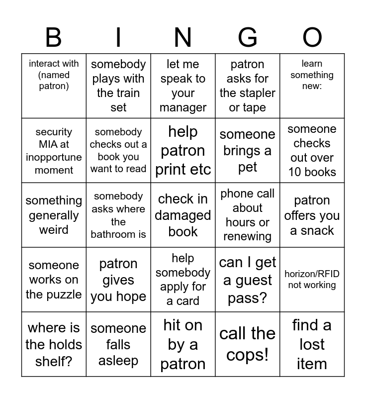 This bingo card has 25 words: patron gives you hope, hit on by a patron, help patron print etc, where is the holds shelf?, learn something new:, interact with (named patron), security MIA at inopportune moment, somebody plays with the train set, phone call about hours or renewing, help somebody apply for a card, someone brings a pet, something generally weird, can I get a guest pass?, horizon/RFID not working, somebody checks out a book you want to read, find a lost item, patron offers you a snack, let me speak to your manager, someone checks out over 10 books, somebody asks where the bathroom is, check in damaged book, someone falls asleep, someone works on the puzzle, patron asks for the stapler or tape and call the cops!.