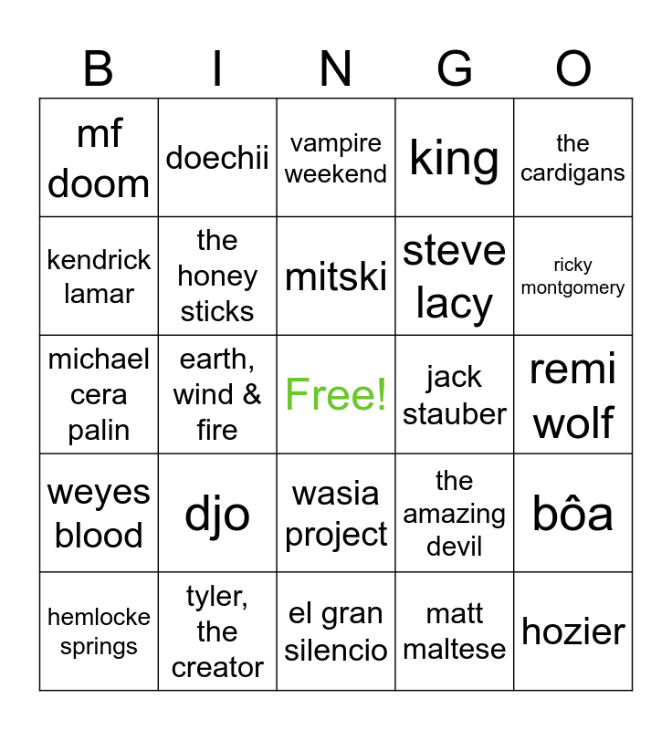 This bingo card has a free space and 24 words: djo, tyler, the creator, mitski, hemlocke springs, the cardigans, mf doom, kendrick lamar, doechii, jack stauber, wasia project, steve lacy, michael cera palin, the amazing devil, bôa, the honey sticks, matt maltese, remi wolf, vampire weekend, ricky montgomery, earth, wind & fire, hozier, weyes blood, king and el gran silencio.