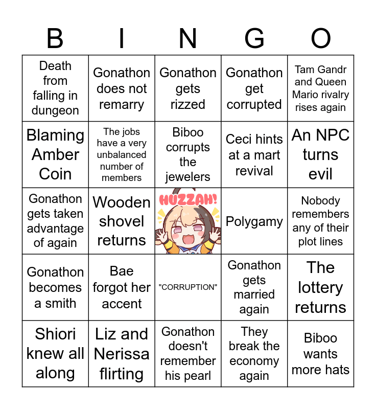 This bingo card has a free space and 24 words: Bae forgot her accent, Liz and Nerissa flirting, Biboo corrupts the jewelers, Shiori knew all along, Tam Gandr and Queen Mario rivalry rises again, Death from falling in dungeon, Blaming Amber Coin, Gonathon does not remarry, Polygamy, "CORRUPTION", Ceci hints at a mart revival, Gonathon gets taken advantage of again, Gonathon gets married again, The lottery returns, The jobs have a very unbalanced number of members, They break the economy again, Nobody remembers any of their plot lines, Gonathon gets rizzed, An NPC turns evil, Wooden shovel returns, Biboo wants more hats, Gonathon becomes a smith, Gonathon get corrupted and Gonathon doesn't remember his pearl.