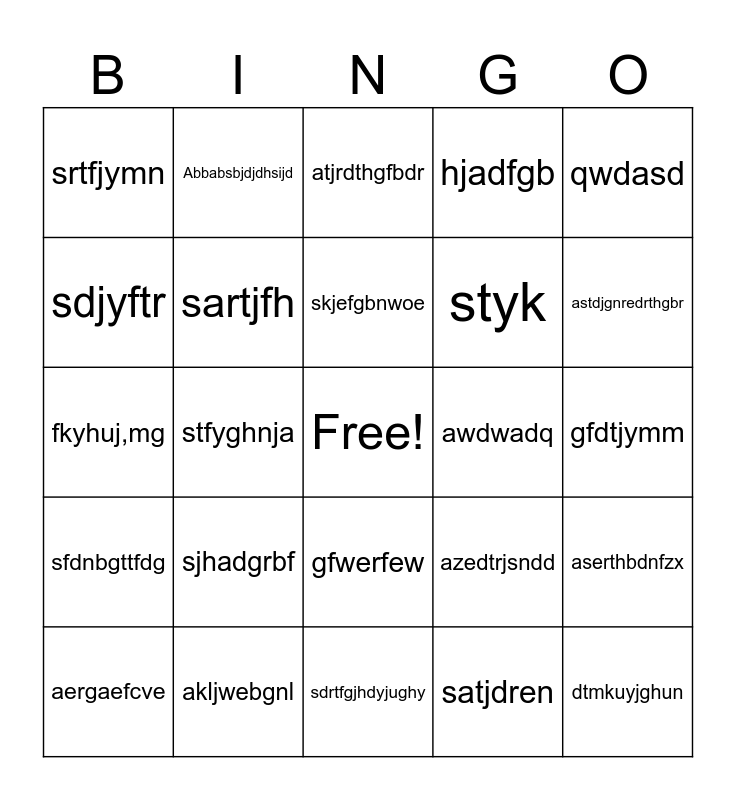 This bingo card has a free space and 24 words: sjhadgrbf, akljwebgnl, skjefgbnwoe, aergaefcve, qwdasd, srtfjymn, sdjyftr, Abbabsbjdjdhsijd, awdwadq, gfwerfew, styk, fkyhuj,mg, azedtrjsndd, aserthbdnfzx, sartjfh, satjdren, gfdtjymm, atjrdthgfbdr, astdjgnredrthgbr, stfyghnja, dtmkuyjghun, sfdnbgttfdg, hjadfgb and sdrtfgjhdyjughy.