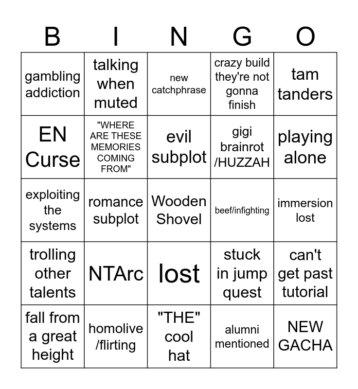 This bingo card has a free space and 24 words: NTArc, homolive /flirting, evil subplot, fall from a great height, tam tanders, gambling addiction, EN Curse, talking when muted, beef/infighting, lost, gigi brainrot /HUZZAH, exploiting the systems, stuck in jump quest, can't get past tutorial, "WHERE ARE THESE MEMORIES COMING FROM", alumni mentioned, immersion lost, new catchphrase, playing alone, romance subplot, NEW GACHA, trolling other talents, crazy build they're not gonna finish and "THE" cool hat.