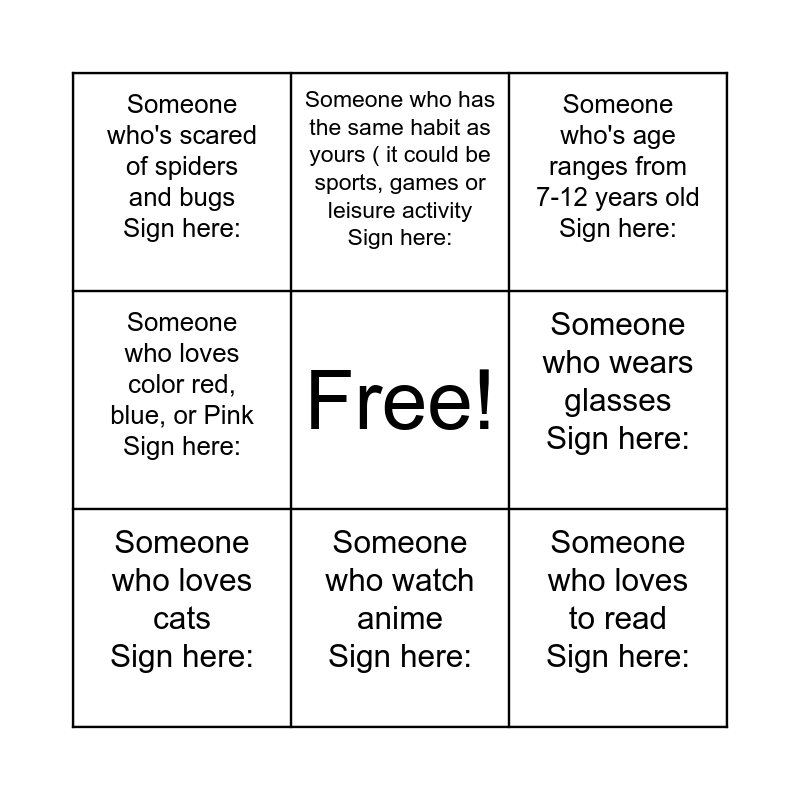 This bingo card has a free space and 8 words: Someone who wears glasses Sign here:, Someone who's age ranges from 7-12 years old Sign here:, Someone who has the same habit as yours ( it could be sports, games or leisure activity Sign here:, Someone who loves cats Sign here:, Someone who's scared of spiders and bugs Sign here:, Someone who loves to read Sign here:, Someone who loves color red, blue, or Pink Sign here: and Someone who watch anime Sign here:.