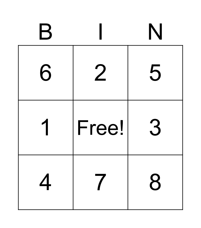 This bingo card has a free space and 8 words: 1, 2, 3, 4, 5, 6, 7 and 8.