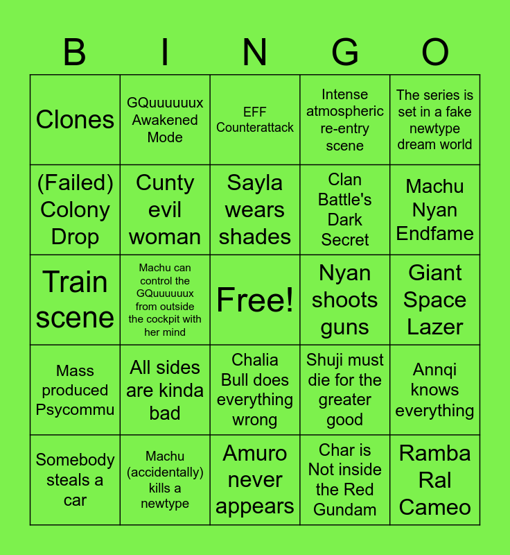 This bingo card has a free space and 24 words: All sides are kinda bad, Machu (accidentally) kills a newtype, Sayla wears shades, Somebody steals a car, The series is set in a fake newtype dream world, Clones, (Failed) Colony Drop, GQuuuuuux Awakened Mode, Nyan shoots guns, Chalia Bull does everything wrong, Clan Battle's Dark Secret, Train scene, Shuji must die for the greater good, Annqi knows everything, Cunty evil woman, Char is Not inside the Red Gundam, Giant Space Lazer, EFF Counterattack, Machu Nyan Endfame, Machu can control the GQuuuuuux from outside the cockpit with her mind, Ramba Ral Cameo, Mass produced Psycommu, Intense atmospheric re-entry scene and Amuro never appears.