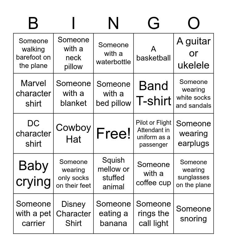 This bingo card has a free space and 24 words: Someone wearing only socks on their feet, Disney Character Shirt, Someone with a bed pillow, Someone with a pet carrier, A guitar or ukelele, Someone walking barefoot on the plane, Marvel character shirt, Someone with a neck pillow, Pilot or Flight Attendant in uniform as a passenger, Squish mellow or stuffed animal, Band T-shirt, DC character shirt, Someone with a coffee cup, Someone wearing sunglasses on the plane, Someone with a blanket, Someone rings the call light, Someone wearing earplugs, Someone with a waterbottle, Someone wearing white socks and sandals, Cowboy Hat, Someone snoring, Baby crying, A basketball and Someone eating a banana.