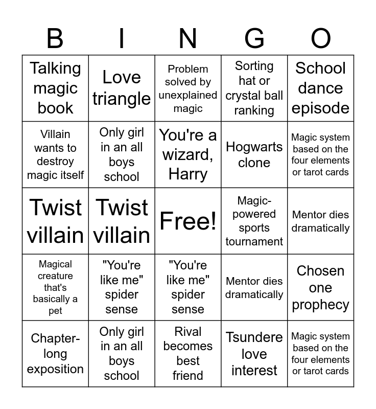 ⚠ This card has duplicate items: Secret royal bloodline reveal (2), Magic system based on the four elements or tarot cards (2), Chapter-long exposition (2), Rival becomes best friend (2), "You're like me" spider sense (2), Magical creature that's basically a pet (2), Love triangle (2), Ancient forbidden spell used anyway (2), Villain wants to destroy magic itself (2), Specific pop culture reference (2), Only girl in an all boys school (2), Sorting hat or crystal ball ranking (2), Chosen one prophecy (2), Mentor dies dramatically (2), Amulet/glowing artifact of destiny (2), MC beats her teacher after one day of training (2), You're a wizard, Harry (2), Magic-powered sports tournament (2), Problem solved by unexplained magic (2), School dance episode (2), Twist villain (2), Tsundere love interest (2), Talking magic book (2), Hogwarts clone (2)