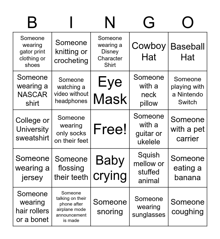 This bingo card has a free space and 24 words: Someone wearing hair rollers or a bonet, Someone flossing their teeth, Eye Mask, Someone wearing sunglasses, Baseball Hat, Someone wearing gator print clothing or shoes, Someone knitting or crocheting, Someone wearing a Disney Character Shirt, Someone with a guitar or ukelele, Someone with a pet carrier, College or University sweatshirt, Someone watching a video without headphones, Squish mellow or stuffed animal, Someone eating a banana, Someone wearing a NASCAR shirt, Someone talking on their phone after airplane mode announcement is made, Someone snoring, Cowboy Hat, Someone playing with a Nintendo Switch, Someone wearing a jersey, Someone wearing only socks on their feet, Baby crying, Someone with a neck pillow and Someone coughing.