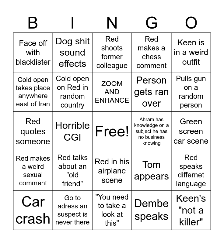 This bingo card has a free space and 31 words: "You need to take a look at this", Red comments than unrelated random monolgue, Horrible CGI, Keen walks off on her own, Face off with blacklister, Red shoots former colleague, Cold open on Red in random country, Tom appears, Ahram has knowledge on a subject he has no business knowing, Dembe speaks, Green screen car scene, Keen's "not a killer", Mr. Whats her name shows up, Keen "You dont have to do this", Pulls gun on a random person, "Im in"/ "We're in ", Red speaks differnet language, Red talks about an "old friend", Red makes a weird sexual comment, Red in his airplane scene, Keen is in a weird outfit, Tease Keen and Red relationship, Car crash, Dog shit sound effects, Person gets ran over, Cold open takes place anywhere east of Iran, Red makes a chess comment, Red quotes someone, Go to adress an suspect is never there, ZOOM AND ENHANCE and No death in the cold open.