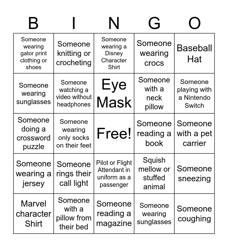 This bingo card has a free space and 24 words: Marvel character Shirt, Someone rings their call light, Eye Mask, Someone wearing sunglasses, Baseball Hat, Someone wearing gator print clothing or shoes, Someone knitting or crocheting, Someone wearing a Disney Character Shirt, Someone reading a book, Someone with a pet carrier, Someone doing a crossword puzzle, Someone watching a video without headphones, Squish mellow or stuffed animal, Someone sneezing, Someone wearing sunglasses, Someone with a pillow from their bed, Someone reading a magazine, Someone wearing crocs, Someone playing with a Nintendo Switch, Someone wearing a jersey, Someone wearing only socks on their feet, Pilot or Flight Attendant in uniform as a passenger, Someone with a neck pillow and Someone coughing.
