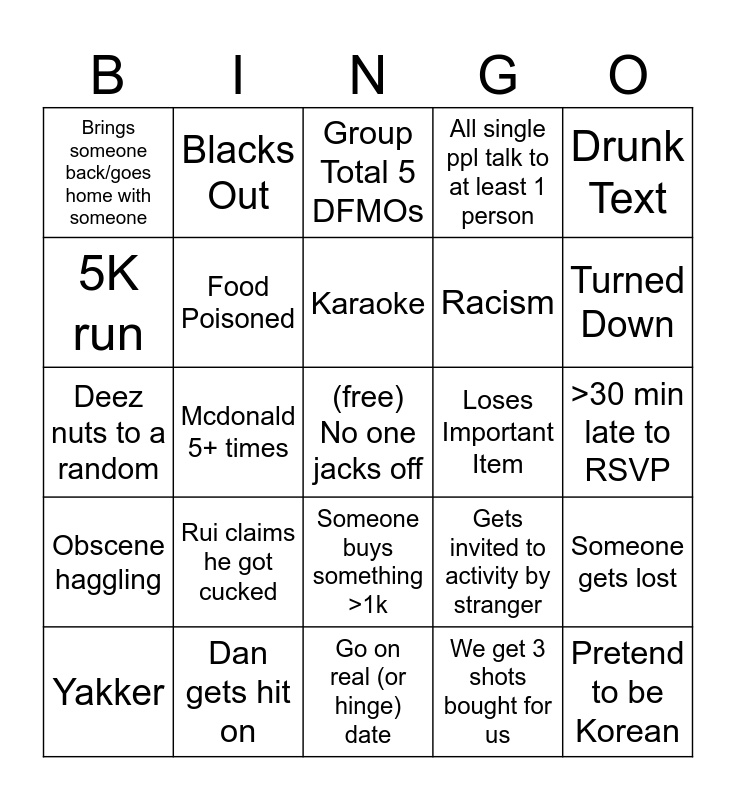 This bingo card has a free space and 24 words: Rui claims he got cucked, Dan gets hit on, Karaoke, Yakker, Drunk Text, Brings someone back/goes home with someone, 5K run, Blacks Out, Loses Important Item, Someone buys something >1k, Racism, Deez nuts to a random, Gets invited to activity by stranger, Someone gets lost, Food Poisoned, We get 3 shots bought for us, >30 min late to RSVP, Group Total 5 DFMOs, Turned Down, Mcdonald 5+ times, Pretend to be Korean, Obscene haggling, All single ppl talk to at least 1 person and Go on real (or hinge) date.