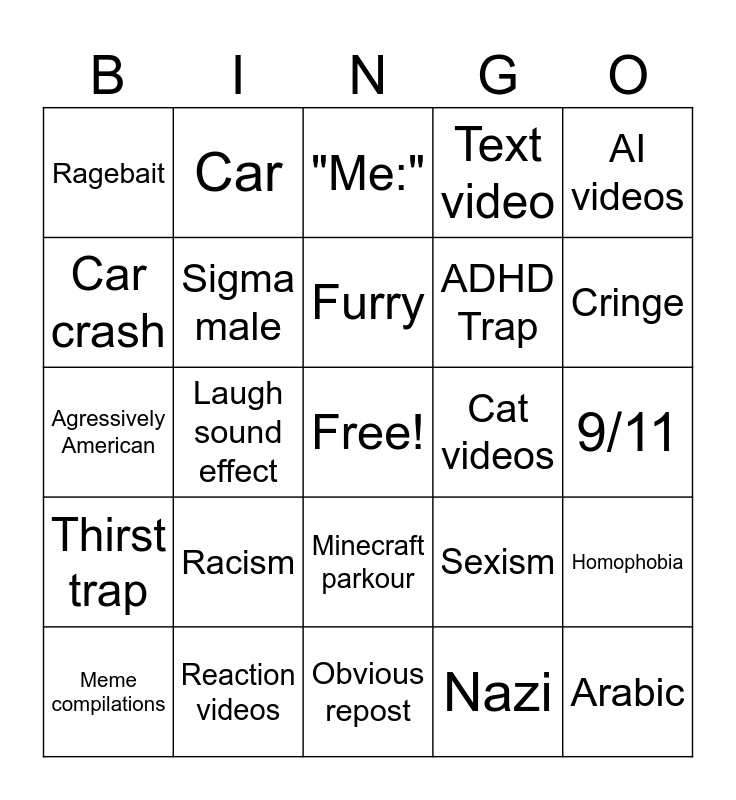 This bingo card has a free space and 24 words: Racism, Reaction videos, Furry, Meme compilations, AI videos, Ragebait, Car crash, Car, Cat videos, Minecraft parkour, ADHD Trap, Agressively American, Sexism, Homophobia, Sigma male, Nazi, 9/11, "Me:", Cringe, Laugh sound effect, Arabic, Thirst trap, Text video and Obvious repost.