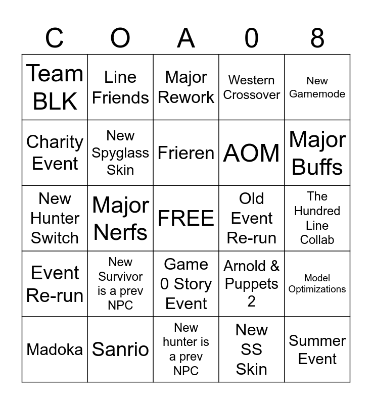 This bingo card has a free space and 24 words: New Survivor is a prev NPC, Sanrio, Frieren, Madoka, New Gamemode, Team BLK, Charity Event, Line Friends, Old Event Re-run, Game 0 Story Event, AOM, New Hunter Switch, Arnold & Puppets 2, Model Optimizations, New Spyglass Skin, New SS Skin, The Hundred Line Collab, Major Rework, Major Buffs, Major Nerfs, Summer Event, Event Re-run, Western Crossover and New hunter is a prev NPC.