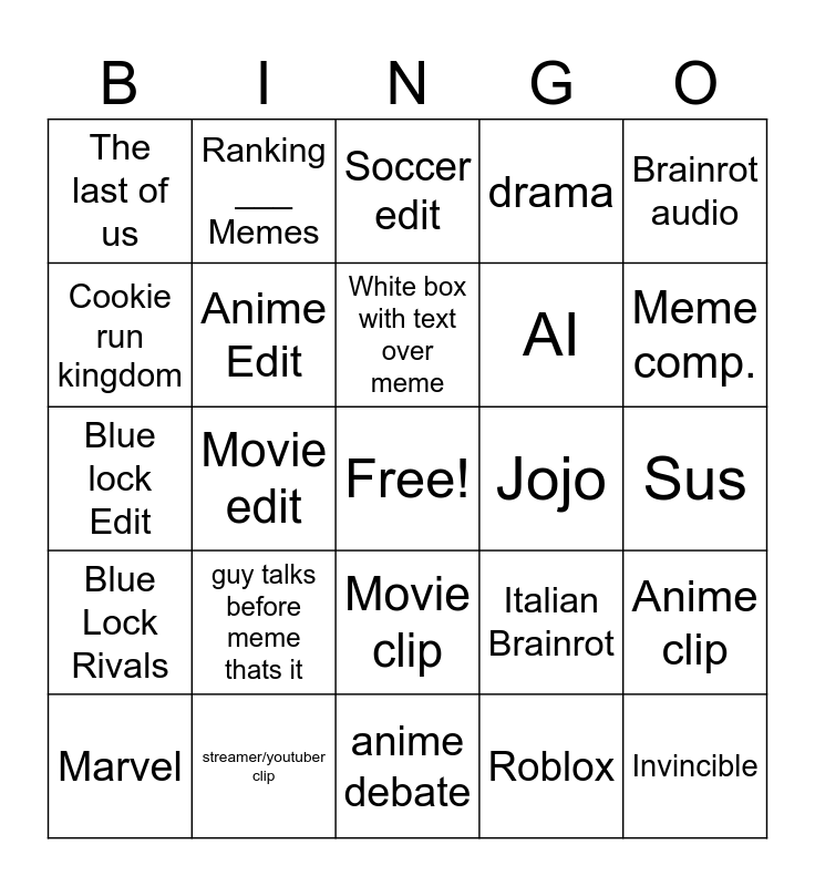 This bingo card has a free space and 24 words: Marvel, guy talks before meme thats it, White box with text over meme, Roblox, Brainrot audio, The last of us, Ranking ___ Memes, Soccer edit, Jojo, Sus, Blue lock Edit, Anime Edit, Italian Brainrot, Anime clip, Cookie run kingdom, streamer/youtuber clip, anime debate, drama, Meme comp., Blue Lock Rivals, Movie edit, Movie clip, AI and Invincible.