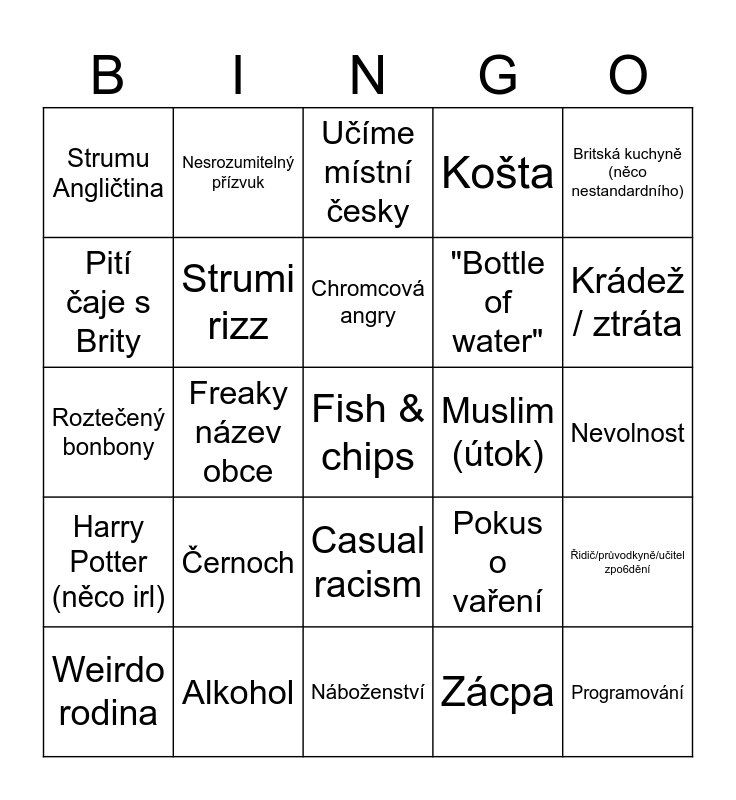 This bingo card has a free space and 24 words: Černoch, Alkohol, Chromcová angry, Weirdo rodina, Britská kuchyně (něco nestandardního), Strumu Angličtina, Pití čaje s Brity, Nesrozumitelný přízvuk, Muslim (útok), Casual racism, "Bottle of water", Roztečený bonbony, Pokus o vaření, Řidič/průvodkyně/učitel zpo6dění, Strumi rizz, Zácpa, Nevolnost, Učíme místní česky, Krádež / ztráta, Freaky název obce, Programování, Harry Potter (něco irl), Košta and Náboženství.