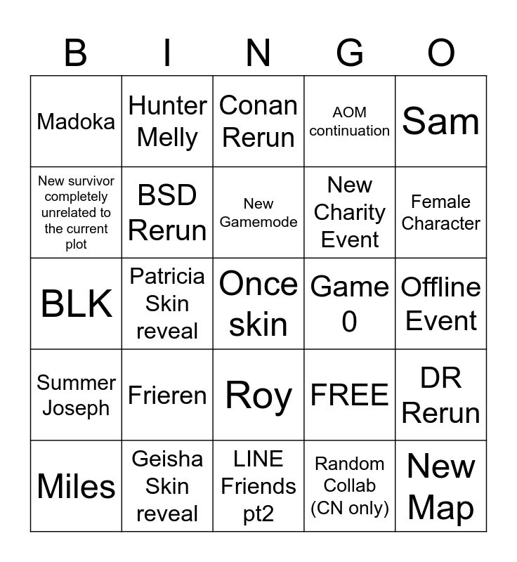 This bingo card has 25 words: Frieren, LINE Friends pt2, New Gamemode, Miles, Sam, Madoka, New survivor completely unrelated to the current plot, Hunter Melly, Game 0, Roy, New Charity Event, BLK, FREE, DR Rerun, BSD Rerun, New Map, Offline Event, Conan Rerun, Female Character, Patricia Skin reveal, Once skin, Geisha Skin reveal, Summer Joseph, AOM continuation and Random Collab (CN only).
