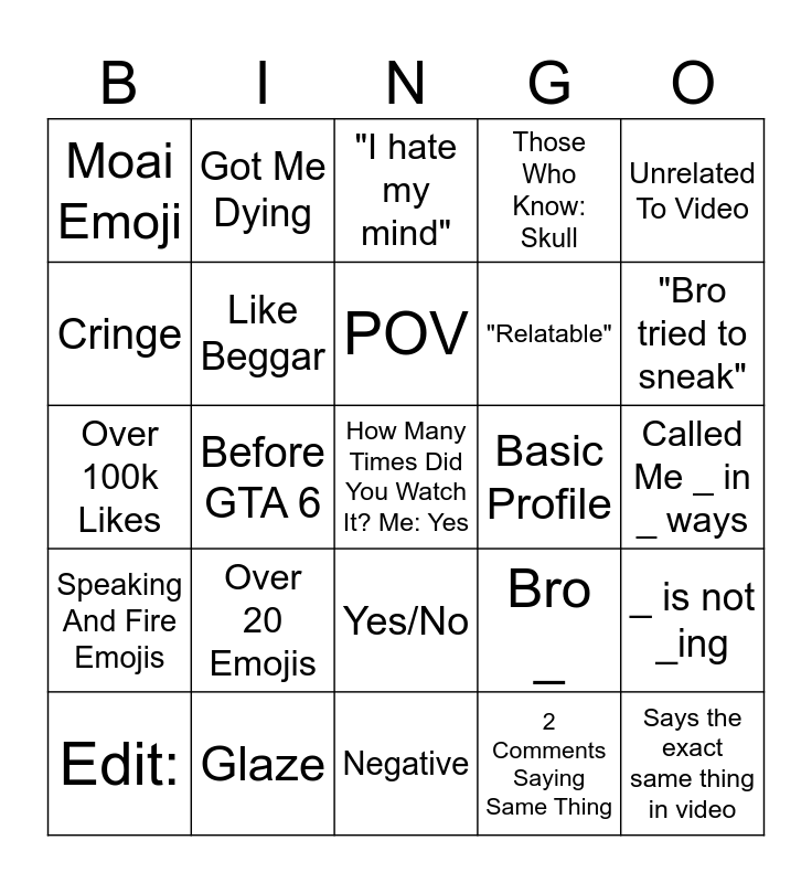 This bingo card has a free space and 24 words: Over 20 Emojis, Glaze, POV, Edit:, Unrelated To Video, Moai Emoji, Cringe, Got Me Dying, Basic Profile, Yes/No, "Relatable", Over 100k Likes, Bro _, _ is not _ing, Like Beggar, 2 Comments Saying Same Thing, Called Me _ in _ ways, "I hate my mind", "Bro tried to sneak", Before GTA 6, Says the exact same thing in video, Speaking And Fire Emojis, Those Who Know: Skull and Negative.