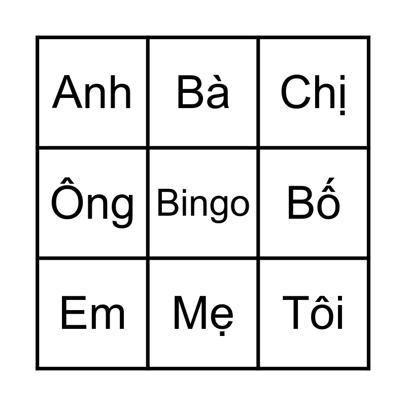 This bingo card has a free space and 8 words: Ông, Bà, Bố, Em, Chị, Anh, Mẹ and Tôi.