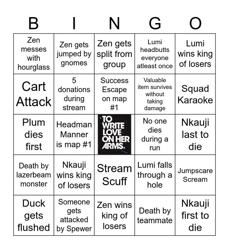 This bingo card has a free space and 24 words: Nkauji wins king of losers, Someone gets attacked by Spewer, Success Escape on map #1, Duck gets flushed, Lumi wins king of losers, Zen messes with hourglass, Cart Attack, Zen gets jumped by gnomes, No one dies during a run, Stream Scuff, Valuable item survives without taking damage, Plum dies first, Lumi falls through a hole, Jumpscare Scream, 5 donations during stream, Death by teammate, Nkauji last to die, Zen gets split from group, Squad Karaoke, Headman Manner is map #1, Nkauji first to die, Death by lazerbeam monster, Lumi headbutts everyone atleast once and Zen wins king of losers.