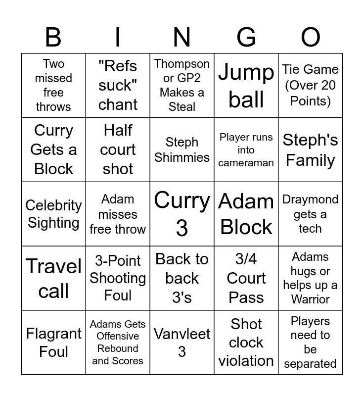 This bingo card has a free space and 24 words: 3-Point Shooting Foul, Adams Gets Offensive Rebound and Scores, Steph Shimmies, Flagrant Foul, Tie Game (Over 20 Points), Two missed free throws, Curry Gets a Block, "Refs suck" chant, Adam Block, Back to back 3's, Player runs into cameraman, Celebrity Sighting, 3/4 Court Pass, Adams hugs or helps up a Warrior, Half court shot, Shot clock violation, Draymond gets a tech, Thompson or GP2 Makes a Steal, Steph's Family, Adam misses free throw, Players need to be separated, Travel call, Jump ball and Vanvleet 3.