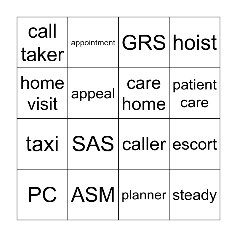 This bingo card has 64 words: ambulance, PTV, stairclimber, carry chair, stretcher, patient, appointment, oxygen, patient care, ACA, control room, day controller, planner, home visit, private journey, appeal, escort, call taker, radio, taxi, wheelchair, steady, hoist, scoop stretcher, A + E, colleague, mentor, risk assesment, email, Lanarkshire, Glasgow, Argyle & Clyde, Ayrshire & Arran, Dumfries & Galloway, SAS, patient transport, admission, transfer, relative, care home, caller, ASM, team leader, manager, desk, PC, printer, keysafe, cleric, East, West, North, ready time, recap, assistance dog, carer, GRS, NHS, hospital, fracture clinic, dental clinic, renal dialysis, emergency service and charity.