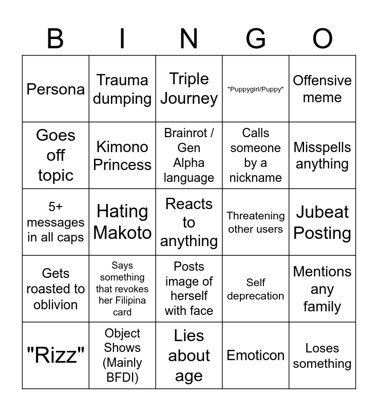 This bingo card has a free space and 74 words: "Nya", Mentions Ryo-chan, Triple Journey, Posts random drawings or doodles, 10+ message long ramble, Becomes self aware, Mentions dream, "Gyatt", "Rizz", "Edging", "Goon", "Hawk Tuah", Brainrot / Gen Alpha language, Goes off topic, Falls asleep, but then wakes up later, Hating Makoto, "What did I do?", Misspells anything, Mentions non-existent lesbian girlfriend, 5+ messages in all caps, Kimono Princess, Trauma dumping, "Puppygirl/Puppy", Message that makes absolutely no sense to a rational human being, Loses something, Trolling Makoto, Terrible opinion, Posts anime GIF, Desperation for a partner, Food pic/Mentions food, Offensive meme, Shower thought, Keyboard smash, Gets 𝓯𝓻𝓮𝓪𝓴𝔂, Speaks in third person, Emoticon, "Cute/Silly", Mentions Round 1, Heartbreak emoji, Sends messages one/two words at a time, Lies about age, Object Shows (Mainly BFDI), Yaoi/Yuri, Body part being hurt, Mentions anything Spotify/music related, Persona, Pings anyone, Says something that revokes her Filipina card, "Meow", DDR Posting, Silver Creek, SDVX Posting, Jubeat Posting, Brainrot song parody, Image of cat-owl, Posts image of herself without face, Posts image of herself with face, "I wish I..", Anything out of pocket, Mentions any family, Calls someone by a nickname, "Adachi", Gets roasted to oblivion, Inflated ego, Threatening other users, Does something random, Simping over something fictional, Misspells a word multiple times consecutively, Self deprecation, Denies being a yapper, Bad economic decision, Gives up on drawing, Goes through a crisis and Wants to cry.