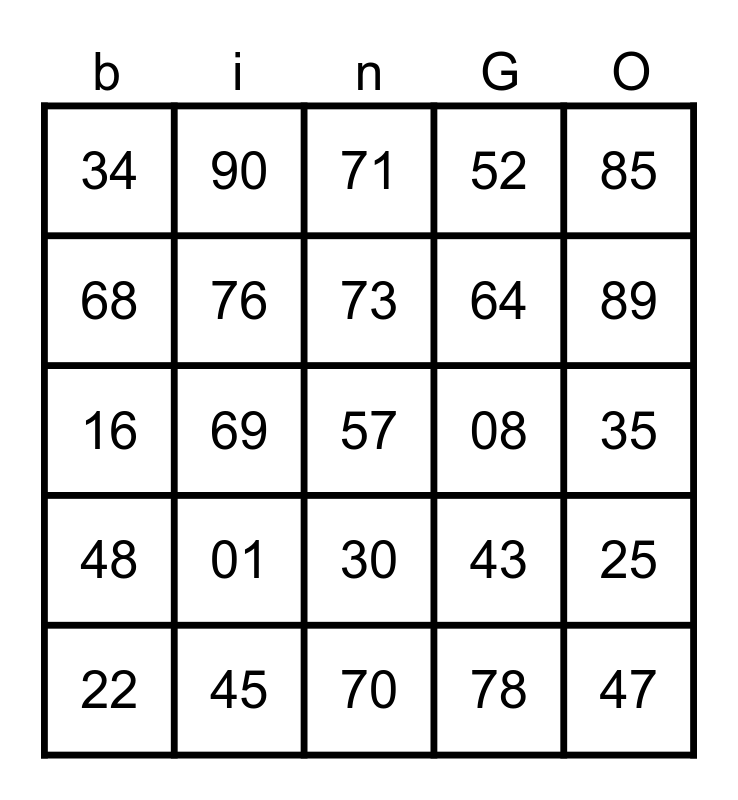 This bingo card has a free space and 24 words: 01, 45, 73, 22, 85, 34, 68, 90, 08, 30, 64, 16, 43, 25, 76, 78, 35, 71, 89, 69, 47, 48, 52 and 70.