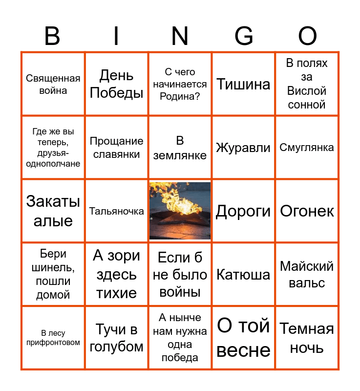 This bingo card has a free space and 25 words: А зори здесь тихие, А нынче нам нужна одна победа, В землянке, В лесу прифронтовом, В полях за Вислой сонной, Священная война, Где же вы теперь, друзья-однополчане, День Победы, Дороги, Если б не было войны, Журавли, Закаты алые, Катюша, Майский вальс, Прощание славянки, Не стареют душой ветераны, Огонек, С чего начинается Родина?, Смуглянка, Тальяночка, Темная ночь, Тучи в голубом, Бери шинель, пошли домой, Тишина and О той весне.