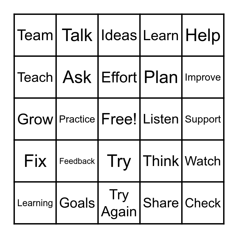 This bingo card has a free space and 24 words: Feedback, Goals, Effort, Learning, Help, Team, Teach, Talk, Listen, Try, Plan, Grow, Think, Watch, Ask, Share, Support, Ideas, Improve, Practice, Check, Fix, Learn and Try Again.