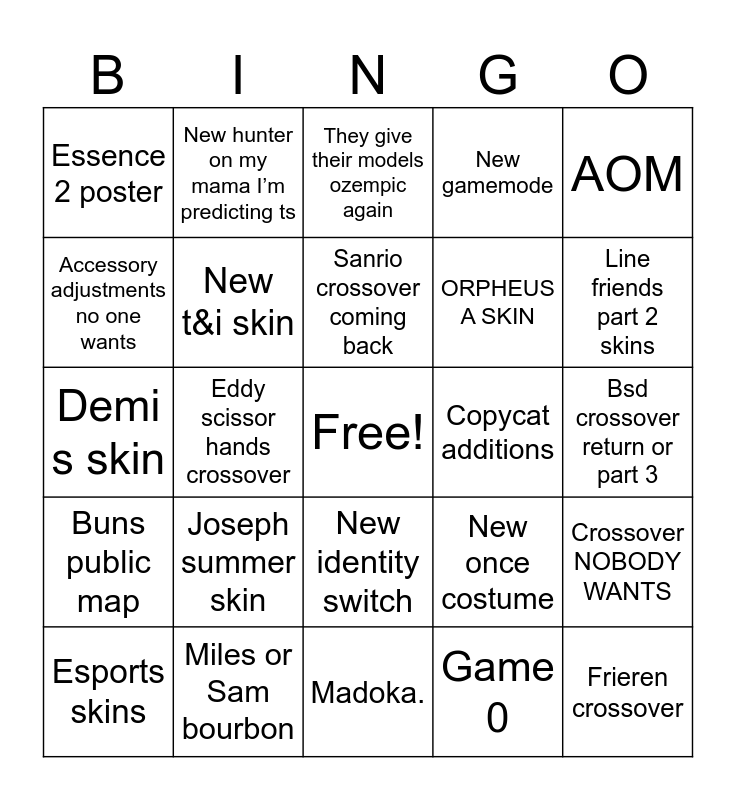 This bingo card has a free space and 24 words: Joseph summer skin, Miles or Sam bourbon, Sanrio crossover coming back, Esports skins, AOM, Essence 2 poster, Accessory adjustments no one wants, New hunter on my mama I’m predicting ts, Copycat additions, New identity switch, ORPHEUS A SKIN, Demi s skin, New once costume, Crossover NOBODY WANTS, New t&i skin, Game 0, Bsd crossover return or part 3, They give their models ozempic again, Line friends part 2 skins, Eddy scissor hands crossover, Frieren crossover, Buns public map, New gamemode and Madoka..