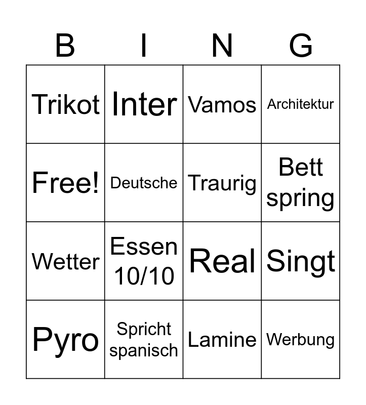 This bingo card has 16 words: Spricht spanisch, Singt, Vamos, Trikot, Wetter, Inter, Real, Lamine, Free!, Deutsche, Pyro, Architektur, Essen 10/10, Bett spring, Traurig and Werbung.
