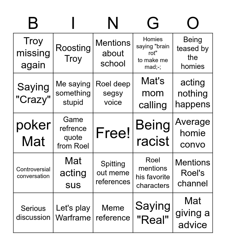 This bingo card has a free space and 24 words: Mat acting sus, Let's play Warframe, Roel deep segsy voice, Serious discussion, Being teased by the homies, Troy missing again, Saying "Crazy", Roosting Troy, Being racist, Spitting out meme references, Mat's mom calling, poker Mat, Roel mentions his favorite characters, Mentions Roel's channel, Me saying something stupid, Saying "Real", Average homie convo, Mentions about school, acting nothing happens, Game refrence quote from Roel, Mat giving a advice, Controversial conversation, Homies saying "brain rot" to make me mad;-; and Meme reference.