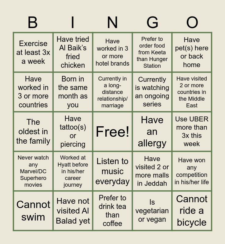 This bingo card has a free space and 24 words: Worked at Hyatt before in his/her career journey, Have not visited Al Balad yet, Currently in a long-distance relationship/ marriage, Cannot swim, Have pet(s) here or back home, Exercise at least 3x a week, Have worked in 3 or more countries, Have tried Al Baik’s fried chicken, Have an allergy, Listen to music everyday, Currently is watching an ongoing series, The oldest in the family, Have visited 2 or more malls in Jeddah, Have won any competition in his/her life, Born in the same month as you, Is vegetarian or vegan, Use UBER more than 3x this week, Have worked in 3 or more hotel brands, Have visited 2 or more countries in the Middle East, Have tattoo(s) or piercing, Cannot ride a bicycle, Never watch any Marvel/DC Superhero movies, Prefer to order food from Keeta than Hunger Station and Prefer to drink tea than coffee.
