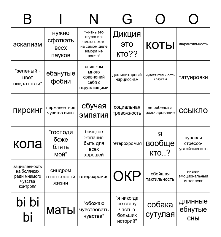This bingo card has 36 words: ОКР, гетерохромия, "я никогда не стану частью больших историй", "зеленый - цвет пиздатости", кола, социальная тревожность, ебанутые фобии, "обожаю чувствовать чувства", коты, ебейшая тактильность, татуировки, Дикция это кто??, низкий эмоциональный интеллект, перманентное чувство вины, дефицитарный нарциссизм, эскапизм, зацикленность на болячках ради мнимого чувства контроля, не ребенок а разочарование, пирсинг, "жизнь это шутка и я смеюсь хотя на самом деле юмора не понял", ебучая эмпатия, "господи боже блять мой", гетерохромия, бляцкое желание быть для всех хорошей, я вообще кто..?, нужно сфоткать всех пауков, чувствительность к звукам, маты, слишком много сравнений себя с окружающими, инфантильность, длинные ебнутые сны, bi bi bi, нулевая стрессо- устойчивость, ссыкло, синдром отложенной жизни and собака сутулая.