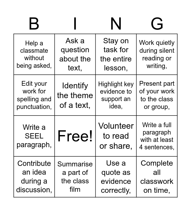This bingo card has 18 words: Free!, Complete all classwork on time,, Stay on task for the entire lesson,, Help a classmate without being asked,, Volunteer to read or share,, Work quietly during silent reading or writing,, Contribute an idea during a discussion,, Ask a question about the text,, Present part of your work to the class or group,, Write a SEEL paragraph,, Use a quote as evidence correctly,, Edit your work for spelling and punctuation,, Write a full paragraph with at least 4 sentences,, Identify the theme of a text,, Highlight key evidence to support an idea,, Read aloud to the class,, Summarise a part of the class film and Explain a character within the film..