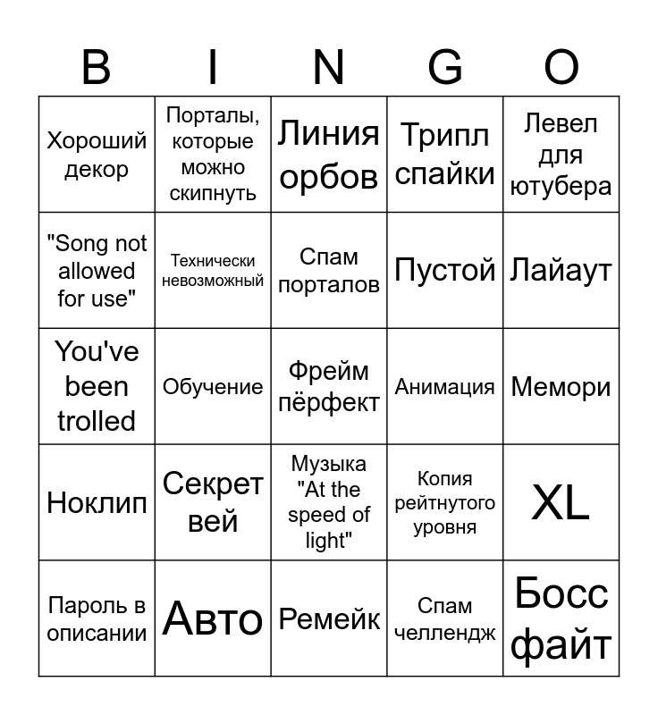This bingo card has a free space and 24 words: Секрет вей, Авто, Спам порталов, Пароль в описании, Левел для ютубера, Хороший декор, "Song not allowed for use", Порталы, которые можно скипнуть, Анимация, Музыка "At the speed of light", Пустой, You've been trolled, Копия рейтнутого уровня, XL, Технически невозможный, Спам челлендж, Мемори, Линия орбов, Лайаут, Обучение, Босс файт, Ноклип, Трипл спайки and Ремейк.