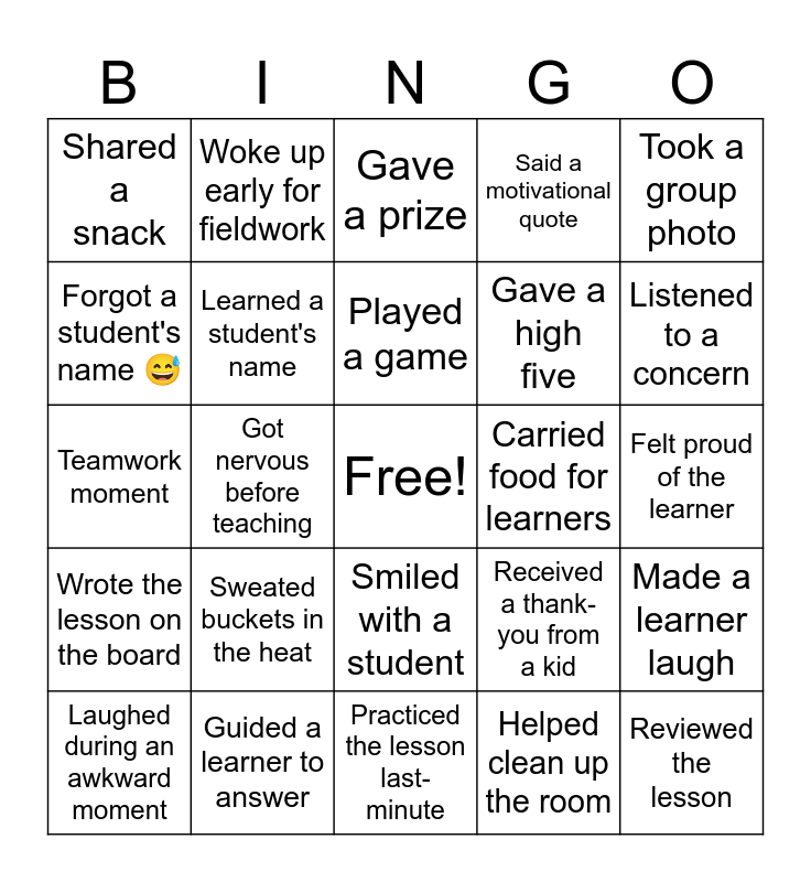 This bingo card has a free space and 24 words: Sweated buckets in the heat, Guided a learner to answer, Played a game, Laughed during an awkward moment, Took a group photo, Shared a snack, Forgot a student's name 😅, Woke up early for fieldwork, Carried food for learners, Smiled with a student, Gave a high five, Teamwork moment, Received a thank-you from a kid, Made a learner laugh, Learned a student's name, Helped clean up the room, Felt proud of the learner, Gave a prize, Listened to a concern, Got nervous before teaching, Reviewed the lesson, Wrote the lesson on the board, Said a motivational quote and Practiced the lesson last-minute.