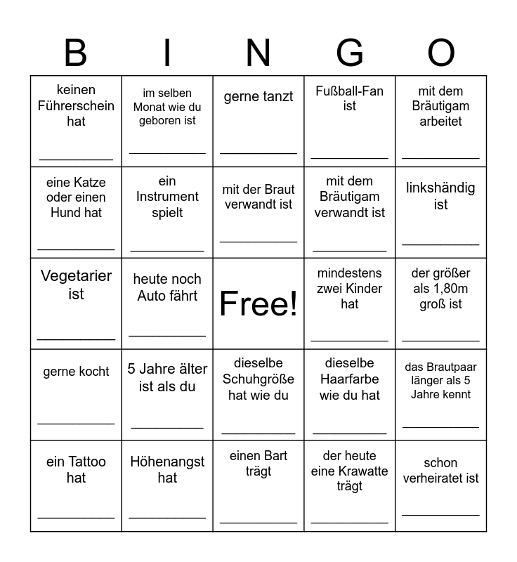 This bingo card has a free space and 24 words: 5 Jahre älter ist als du _________, Höhenangst hat __________, mit der Braut verwandt ist ___________, ein Tattoo hat __________, mit dem Bräutigam arbeitet ___________, keinen Führerschein hat __________, eine Katze oder einen Hund hat ___________, im selben Monat wie du geboren ist ____________, mindestens zwei Kinder hat ___________, dieselbe Schuhgröße hat wie du __________, mit dem Bräutigam verwandt ist __________, Vegetarier ist _________, dieselbe Haarfarbe wie du hat __________, das Brautpaar länger als 5 Jahre kennt ____________, ein Instrument spielt __________, der heute eine Krawatte trägt ___________, der größer als 1,80m groß ist ___________, gerne tanzt __________, linkshändig ist __________, heute noch Auto fährt __________, schon verheiratet ist ___________, gerne kocht ___________, Fußball-Fan ist ___________ and einen Bart trägt ___________.