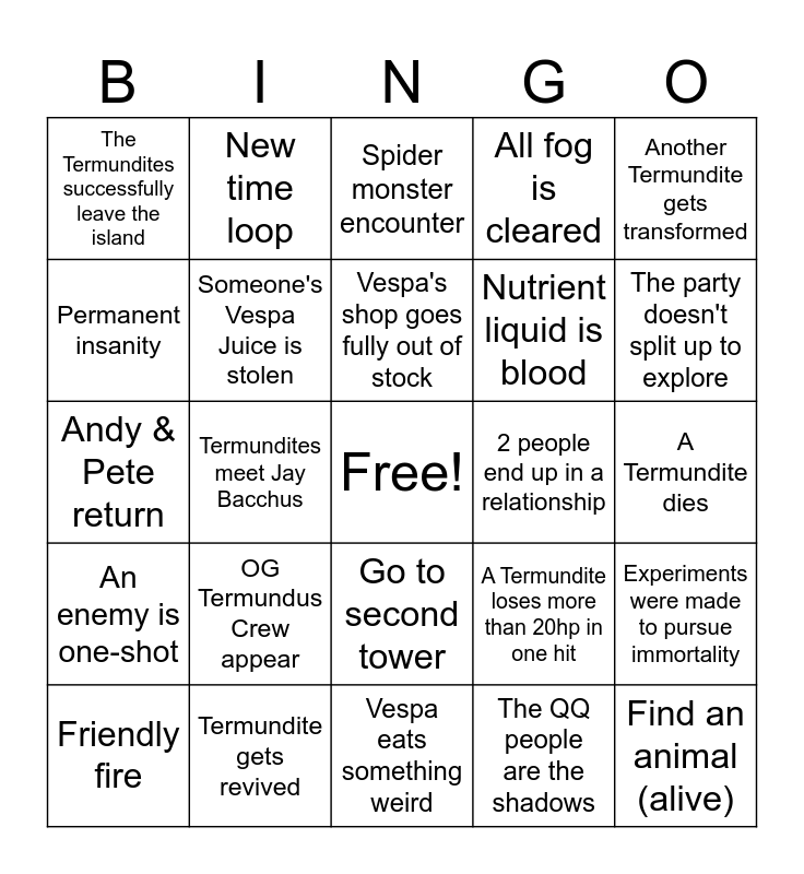 This bingo card has a free space and 24 words: OG Termundus Crew appear, Termundite gets revived, Vespa's shop goes fully out of stock, Friendly fire, Another Termundite gets transformed, The Termundites successfully leave the island, Permanent insanity, New time loop, 2 people end up in a relationship, Go to second tower, Nutrient liquid is blood, Andy & Pete return, A Termundite loses more than 20hp in one hit, Experiments were made to pursue immortality, Someone's Vespa Juice is stolen, The QQ people are the shadows, A Termundite dies, Spider monster encounter, The party doesn't split up to explore, Termundites meet Jay Bacchus, Find an animal (alive), An enemy is one-shot, All fog is cleared and Vespa eats something weird.