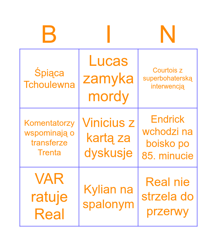 This bingo card has 13 words: Real traci gola w pierwszym kwadransie, Bellingham zagrywa piętką, VAR ratuje Real, Lucas zamyka mordy, Komentatorzy wspominają o transferze Trenta, Vinicius z kartą za dyskusje, Real nie strzela do przerwy, Komentatorzy mówią o zainteresowaniu Saudyjczyków Vinim, Kylian na spalonym, Śpiąca Tchoulewna, Endrick wchodzi na boisko po 85. minucie, Courtois z superbohaterską interwencją and Przynajmniej jeden piłkarz Realu nie gra na swojej naturalnej pozycji.
