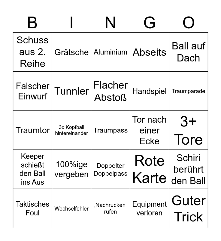 This bingo card has 25 words: 100%ige vergeben, „Nachrücken“ rufen, Flacher Abstoß, Taktisches Foul, Ball auf Dach, Schuss aus 2. Reihe, Falscher Einwurf, Grätsche, Tor nach einer Ecke, Doppelter Doppelpass, Handspiel, Traumtor, Rote Karte, Schiri berührt den Ball, Tunnler, Guter Trick, 3+ Tore, Aluminium, Traumparade, 3x Kopfball hintereinander, Traumpass, Wechselfehler, Keeper schießt den Ball ins Aus, Abseits and Equipment verloren.