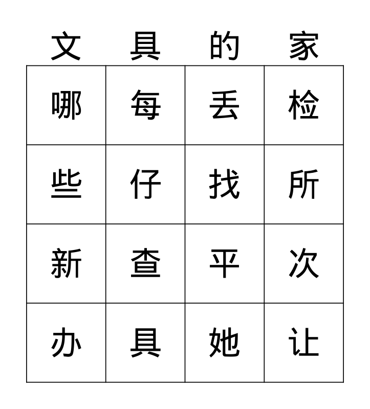 This bingo card has 16 words: 具, 次, 丢, 哪, 新, 每, 平, 她, 些, 仔, 办, 检, 查, 所, 找 and 让.