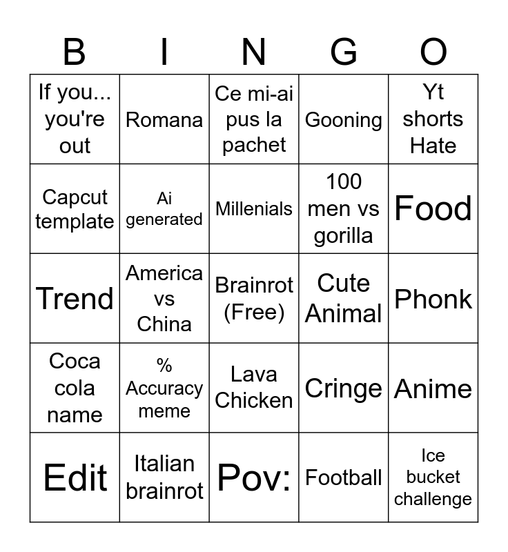 This bingo card has a free space and 24 words: % Accuracy meme, Italian brainrot, Millenials, Edit, Yt shorts Hate, If you... you're out, Capcut template, Romana, Cute Animal, Lava Chicken, 100 men vs gorilla, Trend, Cringe, Anime, Ai generated, Football, Phonk, Ce mi-ai pus la pachet, Food, America vs China, Ice bucket challenge, Coca cola name, Gooning and Pov:.
